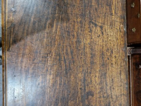 Antique oak, possibly late 17th century, chest of four long drawers, all with geometric moulding, brass pear-shaped drop handles, panelled sides, on stile supports, 91cm high, 97cm wide, 57cm deep   Condition Report 91cm high, 57cm deep. Surface scratches, scuffs and knocks. Areas of fading and discolouration. Evidence of woodworm in numerous places. Some areas of loss and splits to the wood. Handles and locks hace been replaced. General wear and tear.