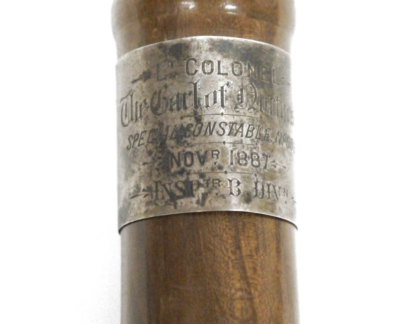 Victorian turned wood police truncheon, with white metal engraved mount named for 'Lt Colonel the Earl of Northesk, Special Constable No.9866, Novr 1887, Insptr B. Divn', 44cm long and a 'The Metropolitan Whistle'