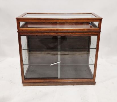 A twentieth century stained wooden collectors display cabinet, having a hinged top and sliding two doors to the front containing two adjustable glazed shelves, measuring approx 87 cm high x 93 cm wide x 39 cm deep (with lock and key)