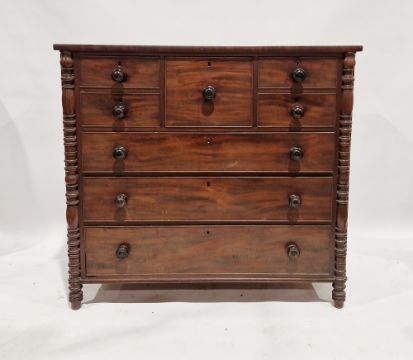 19th century mahogany chest of drawers, possibly Scottish, having a central top hat drawer flanked on either side by two short drawers, raised over a further three long drawers, each with turned wooden handles, 110cm high x 120cm wide x 52cm deep