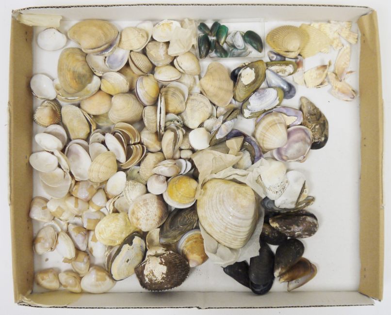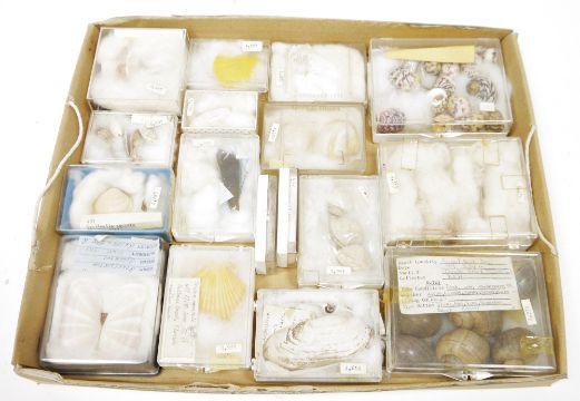 Three trays of specimen seashells, the majority loose, some named and boxed including: Solecurtia, Selcats, Keppel Bay, Murx Reccurvirostris Livides, Mulinia Coloradoensis Dall