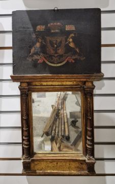 19th century giltwood and gesso armorial wall mirror, of rectangular form with two baluster and mask moulded column supports, surmounted with a 19th century coat of arms reserved against a black ground, depicting spread eagle and the motto 'Tache Sans Tache' above a coronet and two flags titled 'Britannia Victrix', 63cm x 33.5cm (suspended for hanging) (adapted)