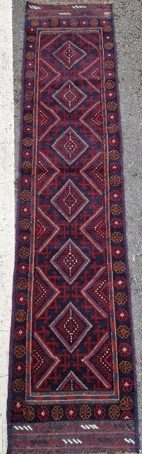 Meshwani runner, woven with a central band of lozenges in blue, red and cream, within flowerhead border, 241cm x 54cm