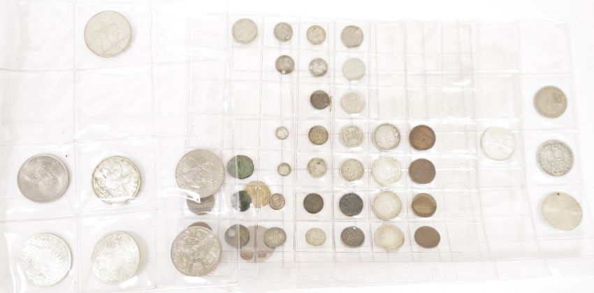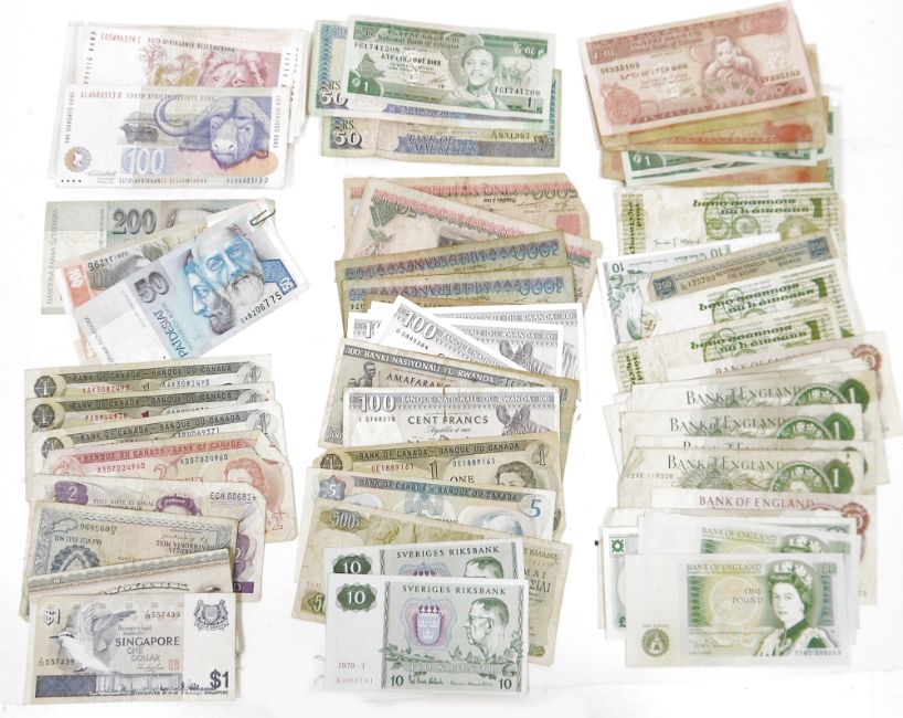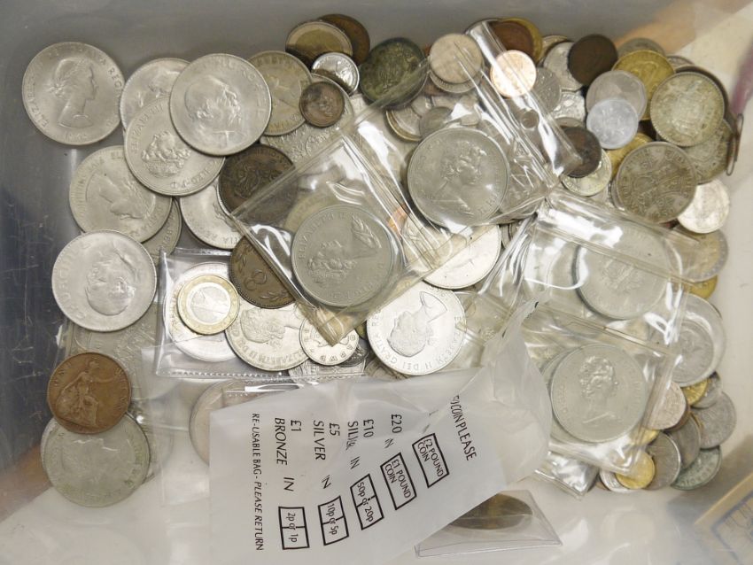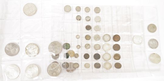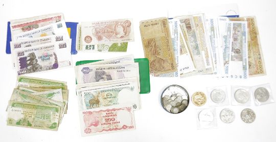 Large collection of coins and banknotes including Elizabeth II Silver Jubilee crowns, two 1780 Maria Theresa thalers, a group of Elizabeth II five pound coins, a group of late 19th century coins including sixpences and a couple of Roman coins