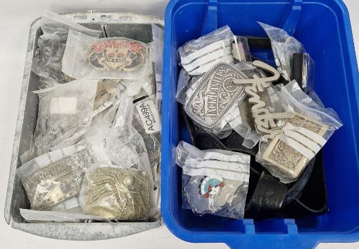 Quantity of belt buckles comprising Fender, Jack Daniels, Harley Davidson etc., together with a souvenir piece of the Berlin wall ( 2 boxes)