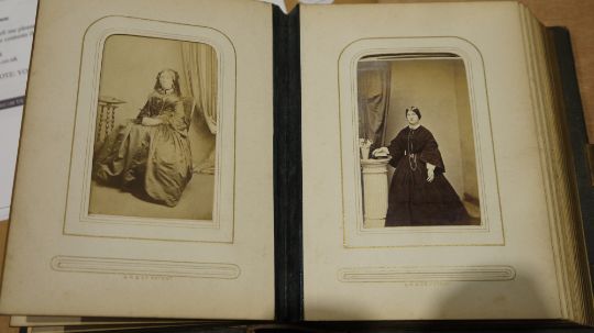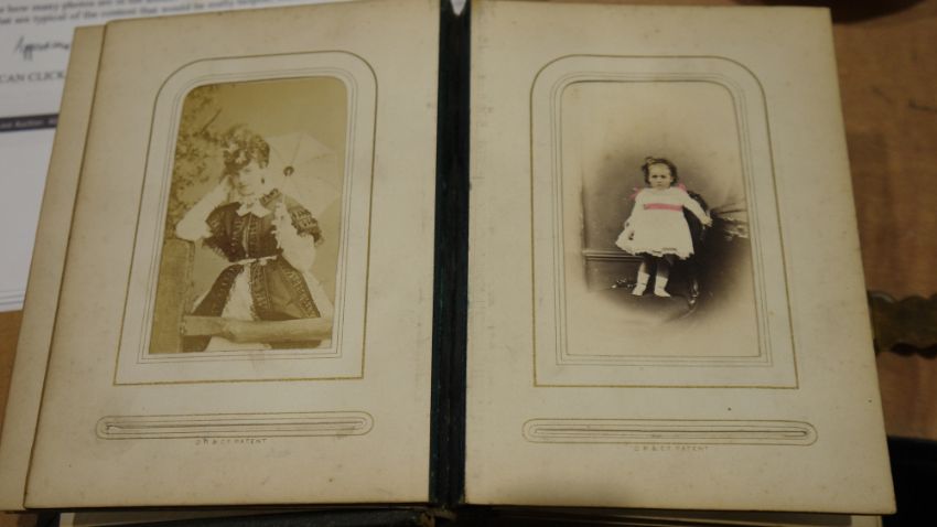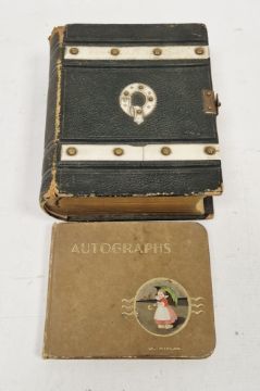 Victorian leather and bone mounted photograph album, with belt finial to the outer front cover, containing a selection of period family portraits, with brass clasp, together with a 20th century autograph album  Condition Report Request: How many photographs? (only) Approximately 26