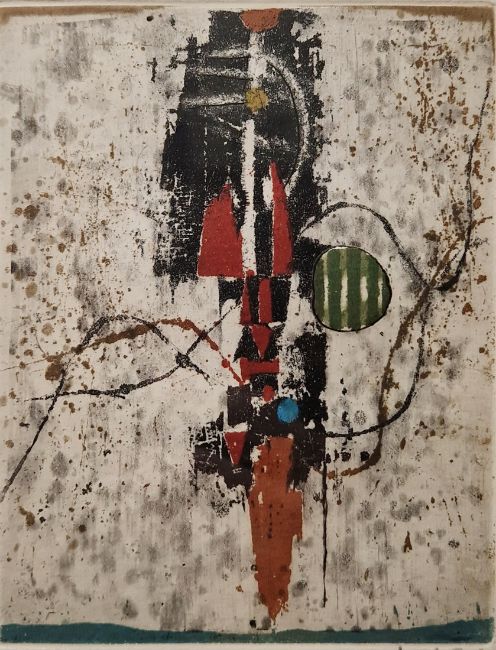 and three other framed unattributed abstract pictures to include a watercolour, an etching and aquatint and another (4) ( see new images)
