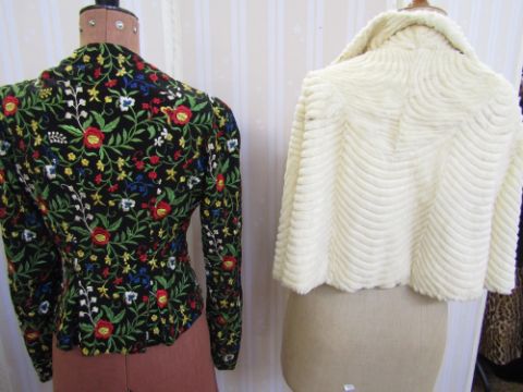 1920s embroidered silk evening jacket, embroidered all over with flowers, the colours bright, single clasp fastening, bakelite clasps, with leg o' mutton sleeves and a slight peplum to the back, and a 1920s white coney fur cape with a bakelite clasp fastening, one black and and one white (2)
