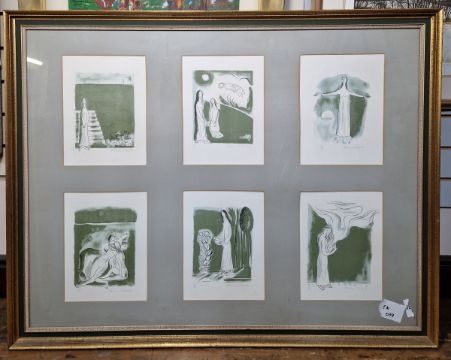 'Prose, Poems From Les Illuminations of Arthur Rimbauld', each scene signed in pencil and numbered 2/20, with Dawn, Bottom, Mystic, Childhood II, Being Beauteous and Devotion text, all framed and glazed, 108cm x 82cm
