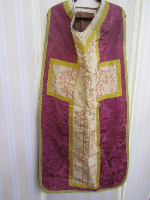 Religious cope, possibly theatrical, purple damask, cream damask trimmed with gold-coloured braid and stiffened with canvas