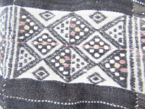 African Mali (Fulani) vintage wool wedding blanket, woven in cream, red and black with lozenge-shaped panels, alternating with striped bands, 243cm x 128cm