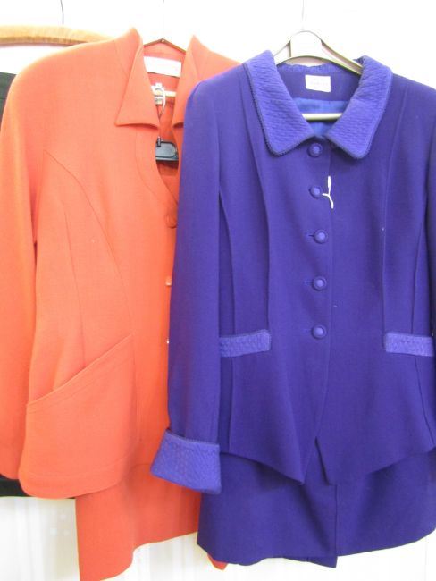 Paul Costelloe lilac-coloured trouser suit, a Claude Rap red crepe and leather skirt suit, an Admont Bavaria tweed skirt suit with a green wool skirt, a Claude Rap orange crepe skirt suit, raglan sleeves, orange button fastening, and a Caroline Charles blue crepe skirt suit (8)