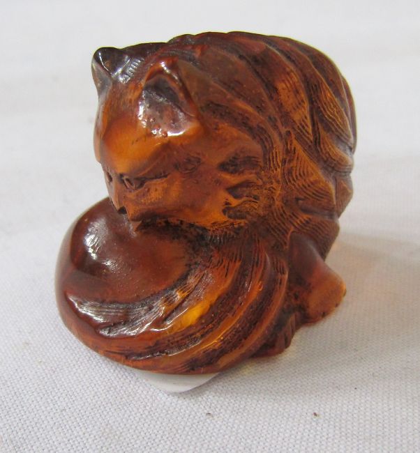 Japanese carved amber netsuke in the form of a fox, 2.5cm high, and a small collection of Asian mother-of-pearl engraved gaming counters in chinoiserie lacquered rectangular frame, 23.5cm high (2)