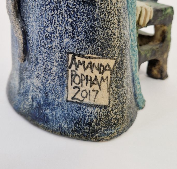 Amanda Popham (b.1954) 'The Household Gods Keep Watch' studio pottery figure group of three humanoid dog figures behind a seated figure, signed and dated 2017 to base, 33cm high