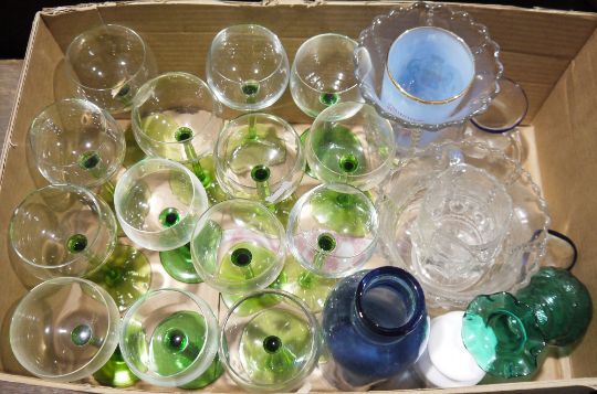 Set of 14 green stemmed hock glasses, a small quantity of irridescent and milk glass bowls and vases, probably by Fenton, a small quantity of lacquered bowls with gilt Chinese decoration and further assorted china, glassware and collectables (4 boxes)