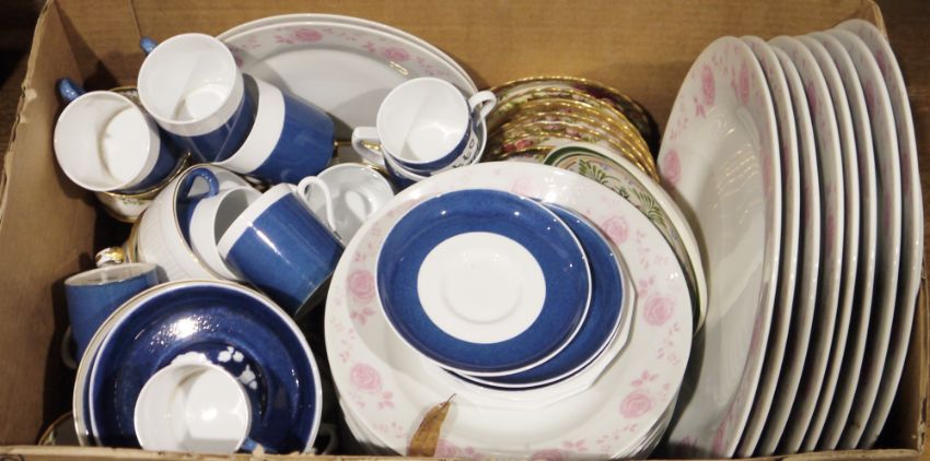 A set of Spode Copeland blue and white china coffee cups and saucers, a Portmeirion Botanic Garden flower pot, a set of four Westminster china Australia pattern lustre tea cups and saucers, together with further chinaware (3 boxes)