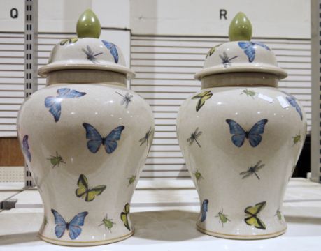 Pair of India Jane vases with covers, decorated with butterflies, dragonflies and beetles, on a white crackle ground (2)