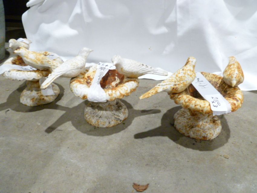 Three white painted cast iron birdbaths  of urn form, each with two perched birds (3)