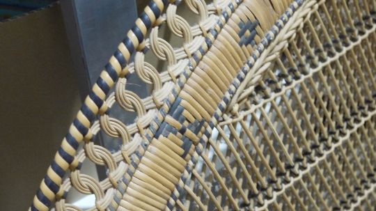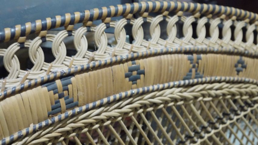 Some splits, wear and loosening to both cane items. Scratches and dirt throughout. Some frayed edges and stains to table linen. Scratches, marks and wear throughout garden chairs. More obvious stains to seat of blue chair. Discolouration, wear and ash residue to fire place surround. Please see additional photos.