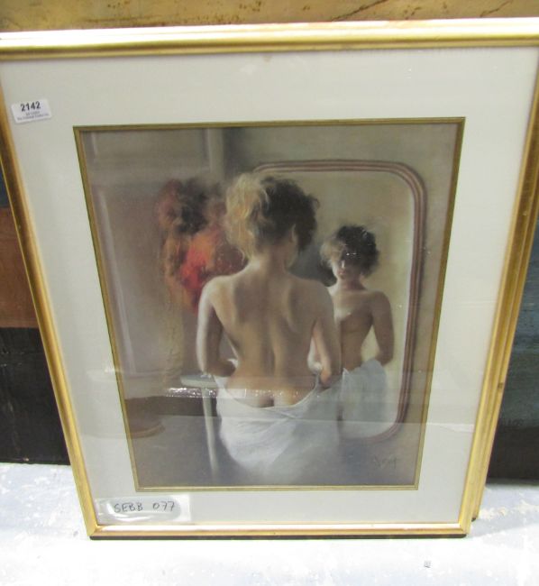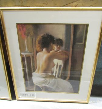 Two framed prints, indistinctly signed in the print   ' Female nude facing a mirror' and another similar ( 2)