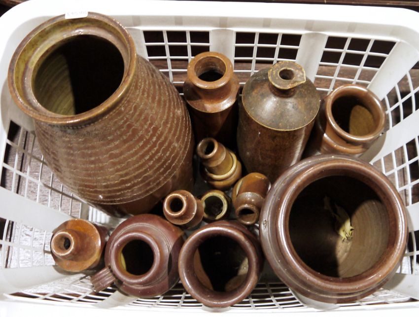 Small quantity of stoneware bottlestwo stoneware vases and please note the teddy bear is now a lot in the Teddy Bear Section a vintage teddy bear (1 box)