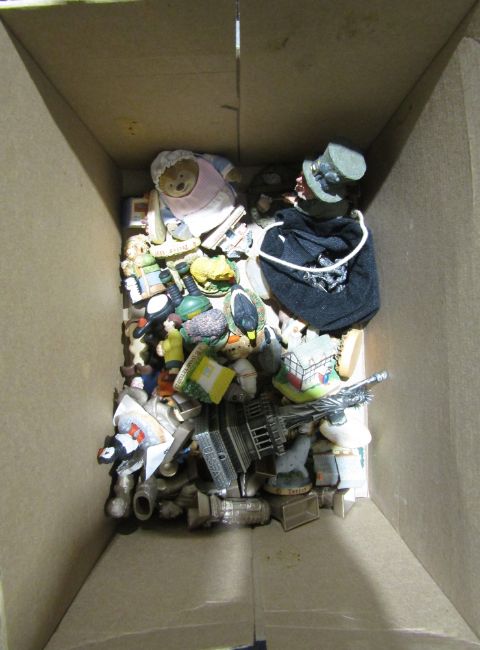 Assorted Wallace & Grommit and other souvenir figurines and a collection of metal knights etc. ( 2 boxes)