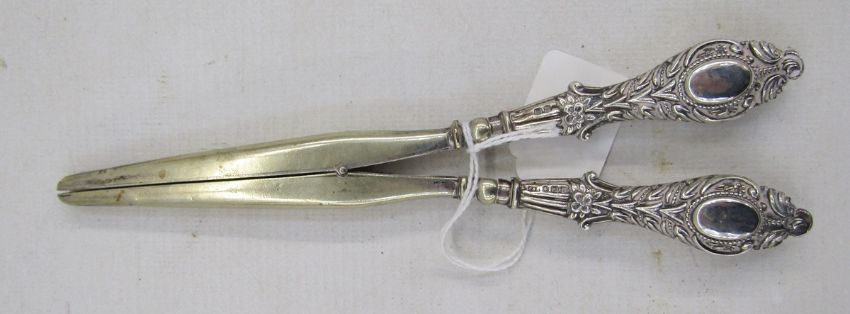 Three various silver teaspoons, a silver sugar sifting spoon, a pair of Irish Victorian silver asparagus tongs with curved handles, Dublin 1864, maker possibly John Smyth, silver-handled glove stretchers and various silver salt spoons (1 bag)