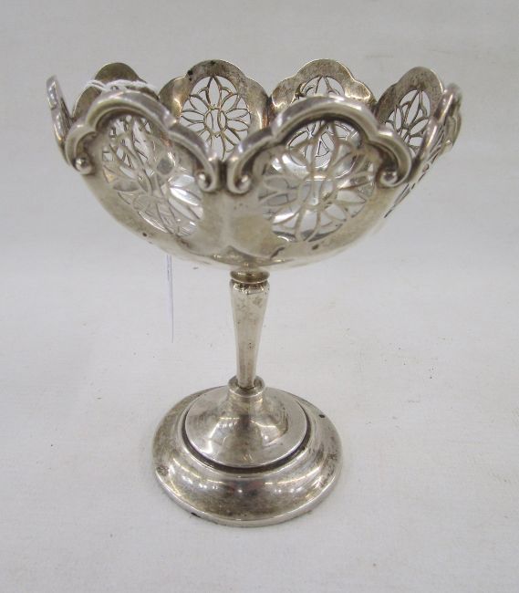 George V silver bon bon dish by Mappin & Webb, with pierced filigree border, on slender stem with circular pedestal base, hallmarked Birmingham 1911, 103g/3.3ozt