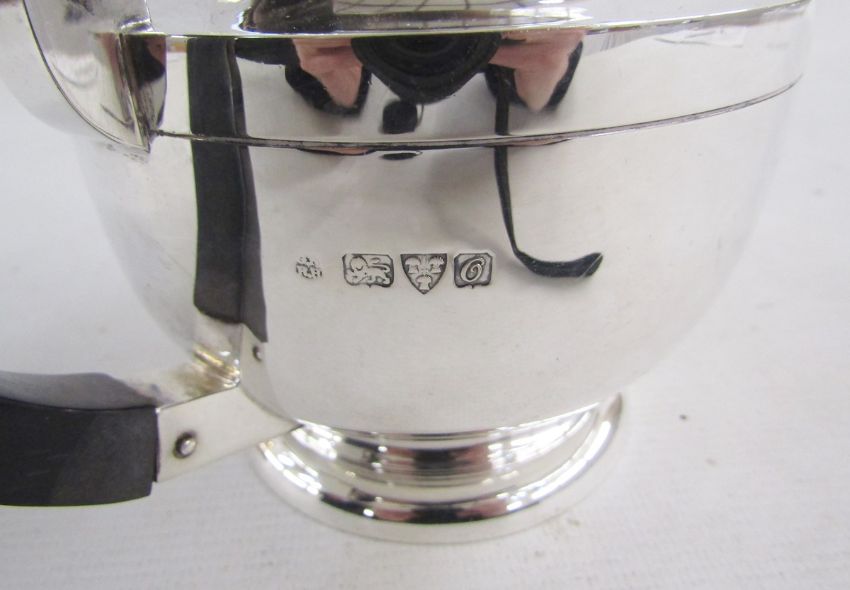 George V silver part tea-service, comprising: a teapot with hinged cover, turned wood handle and finial, a footed circular creamboat, and a circular two-handled sugar-bowl, hallmarked Sheffield, 1914, indistinct maker's mark, gross weight 20.34 ozt