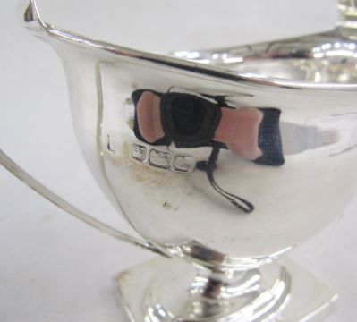 Early 20th century Georgian-style silver two-handled oval footed sugar-bowl, hallmarked Sheffield, remainder indistinct, with curved upright handles, cast to the front with a neo-classical maiden before an anchor, on integral rectangular base, 12.5cm high, 5.61 ozt