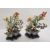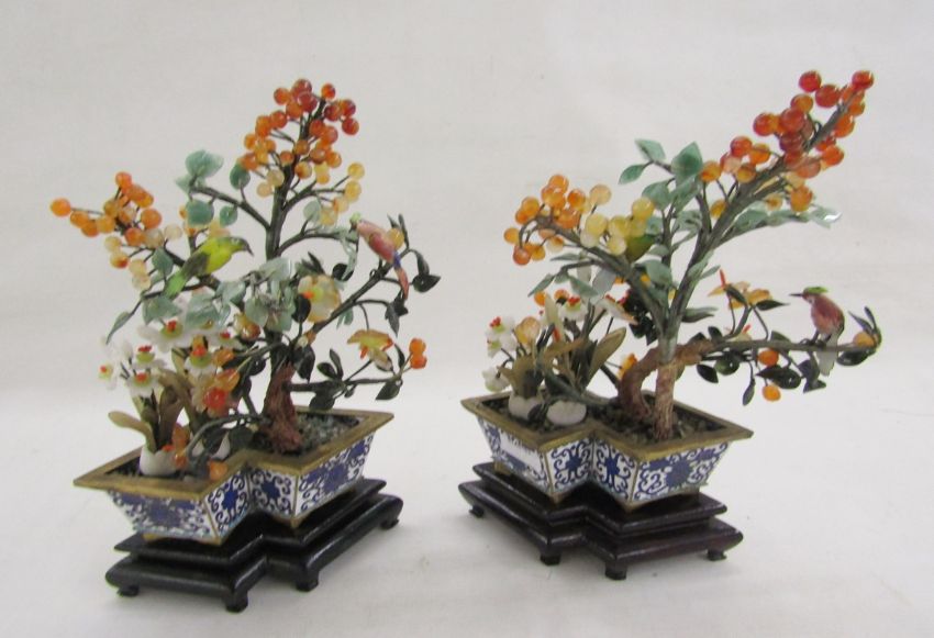 Pair of Chinese enamel hardstone mounted trees, each mounted with a painted tall bird set with berries and foliage in coloured hardstones, within a double lozenge section cloisonne enamel flowerpot and similar ebonised stand, 22cm high (2)
