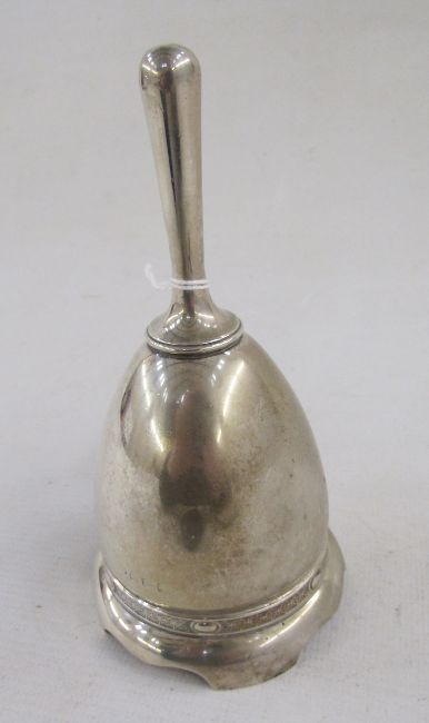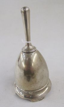 Table bell with tapering handle, the domed body with Celtic bead and star band on serpentine shaped foot,13 cm, Birmingham assay, marks worn