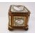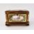 Late 19th century French enamel and gilt metal-mounted jewellery casket, of canted rectangular form decorated with figures after Watteau in landscape, within turquoise seeded borders, decorated with red palmettes and scrolls on a yellow ground, raised on foliate drill-shaped feet, the interior lined in green silk, 16cm wide (damages and losses to the enamelled panels)