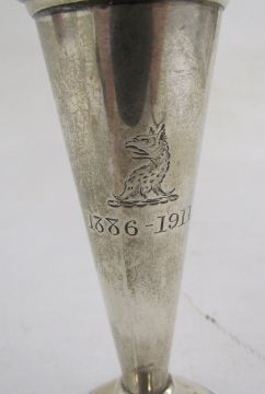 Pair silver vases , each with crimped, everted rim on circular foot, Birmingham 1910, and another pair with petal everted rims on circular foot, Birmingham 1906, weighted and with damage