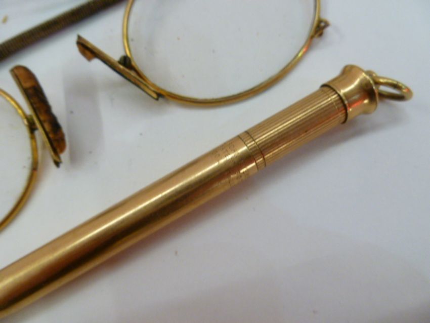 Vintage rolled gold Mordan Everpoint propelling pencil and three early 20th century gilt-metal spectacles, the pencil stamped Patent 307227