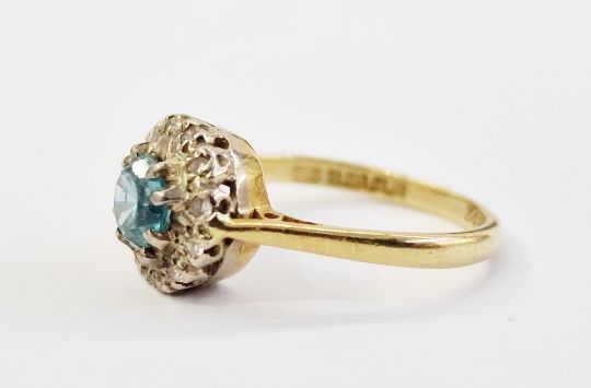 9ct gold zircon and diamond ring, set single blue stone to centre and surround of tiny diamonds size K, 3.4g gross approx.
