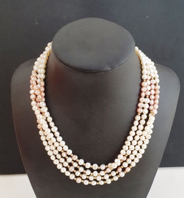 Freshwater pearl sautoir necklace, pink and cream, interspersed with gold-coloured ball spacers, 168cm long