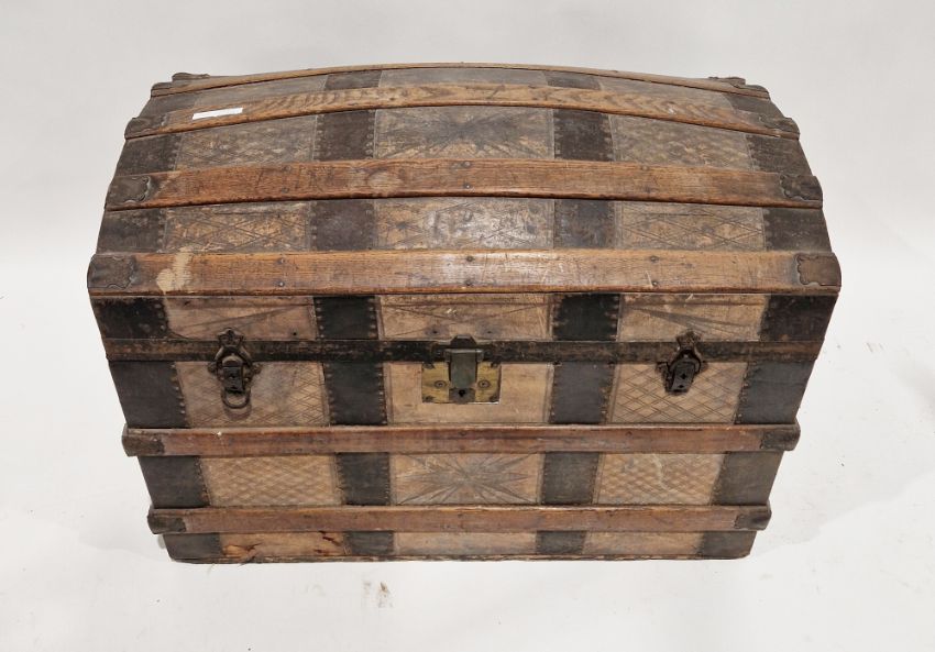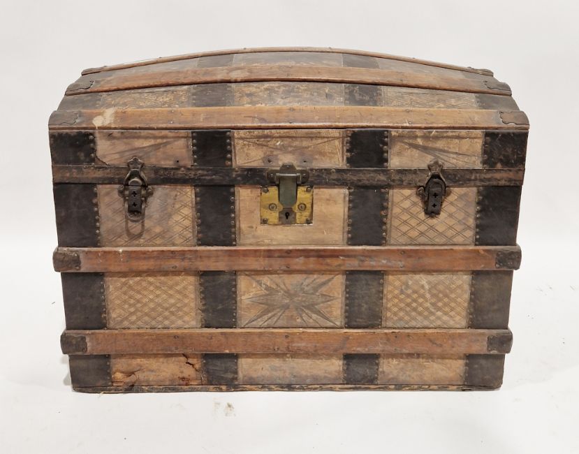 Late 19th/early 20th century tooled leather, oak and iron-banded travelling trunk, of domed form, tooled with starbursts and hatched ornament with brass lock, the interior fitted with removable tray and lidded compartments, the reverse inscribed 'Boothmen', 87cm wide