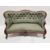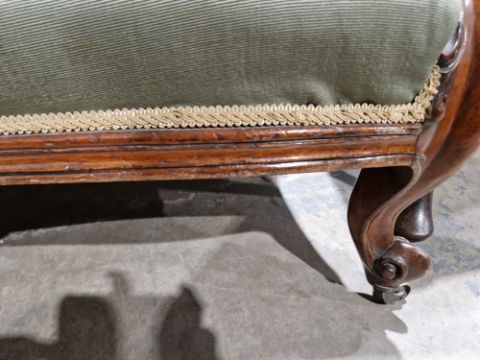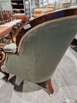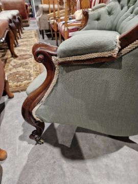 Victorian mahogany-framed parlour sofa, with scroll button back and foliate carved frame, upholstered in green fabric, on scroll legs and brass and porcelain castors, 89.5cm high x 86cm deep  Condition Report Surface scratches, scuffs and knocks to the wooden frame. Some fading and stains to the upholstery. Repair to back left leg. General wear and tear.Width approx. 161cm