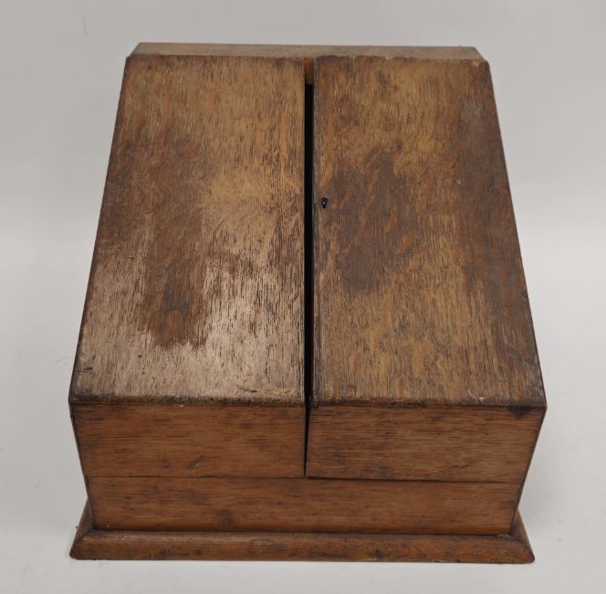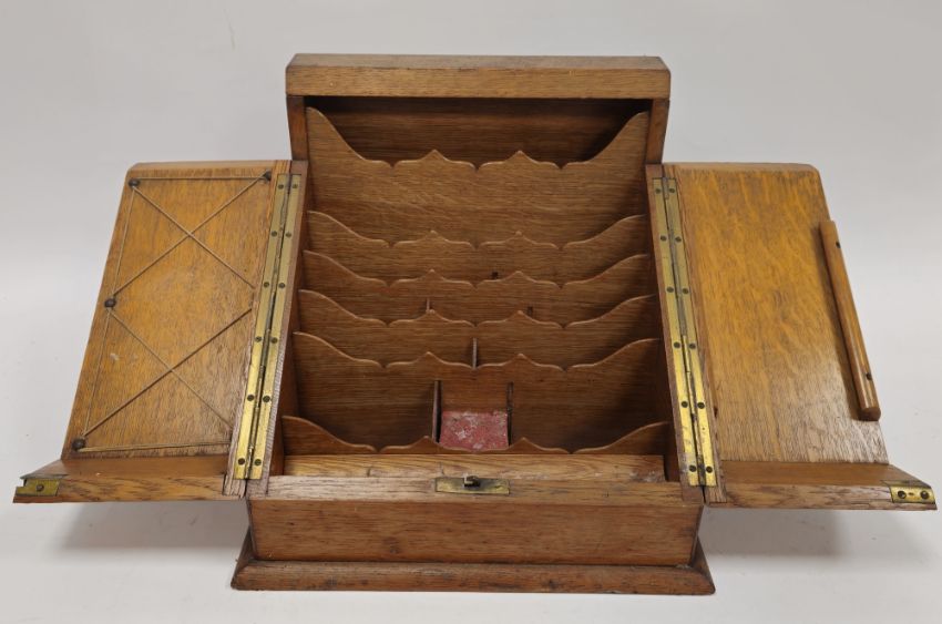 Victorian oak stationery box of canted hinged form enclosing a series of tiered racks and a pen rest, 34cm wide