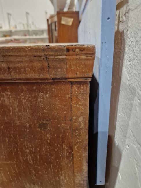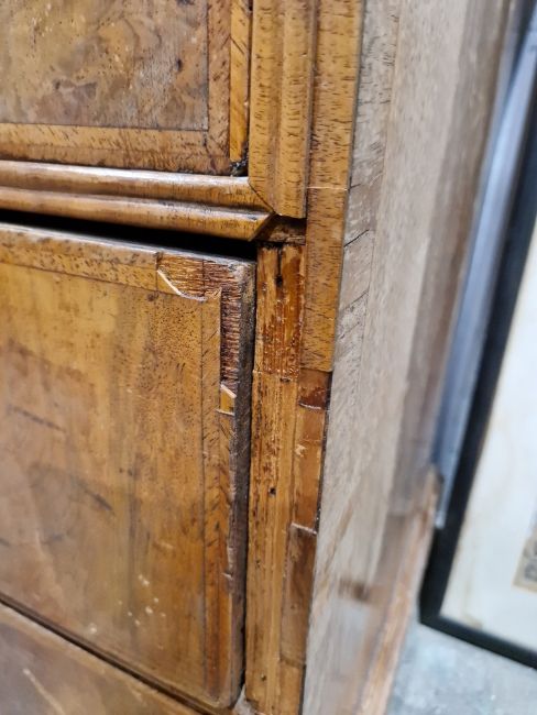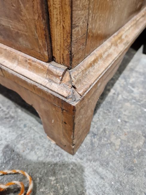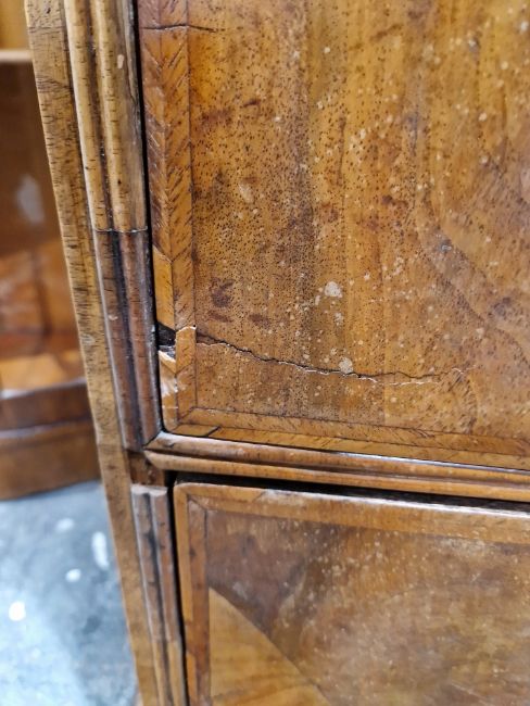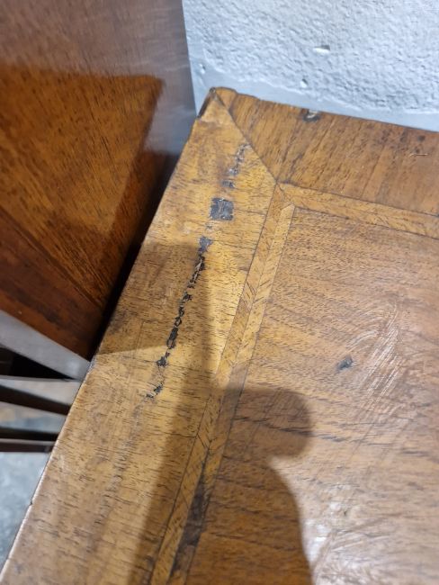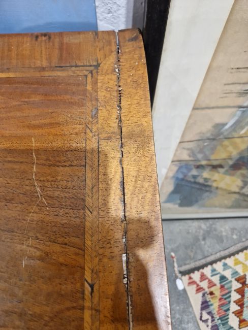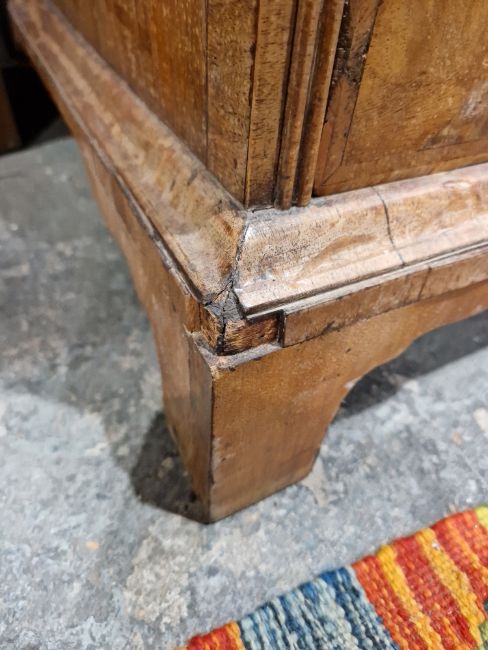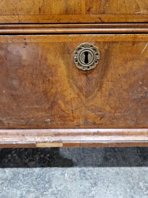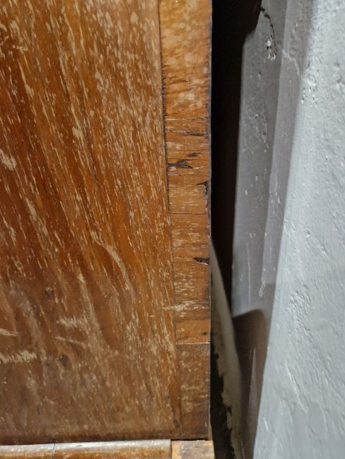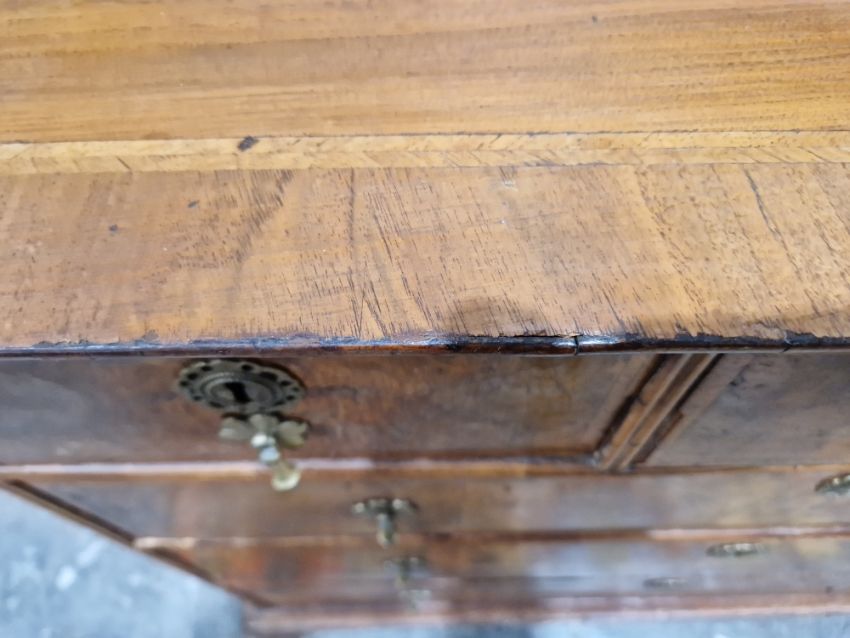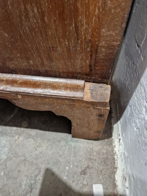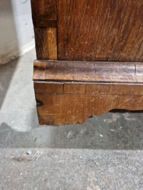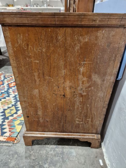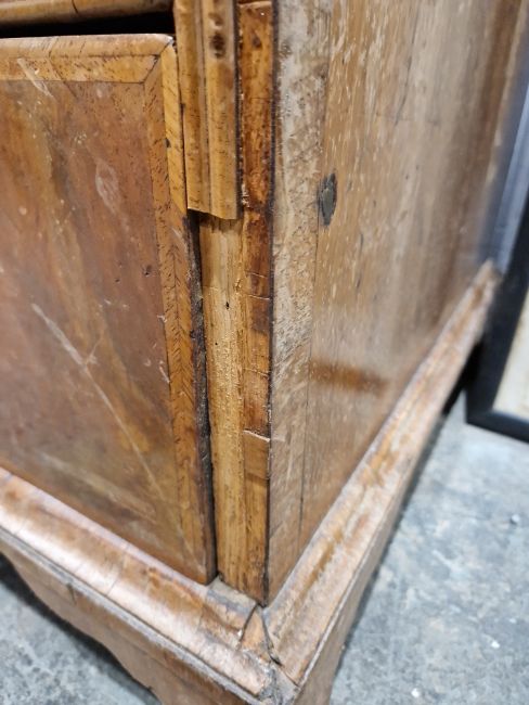 Surface scratches, scuffs and knocks. Fading/discolouration and stains. Numerous losses and repairs to veneer. Back left leg missing. Handles and locks not original, splits to top, top moulding on right side is coming away. Some has scratched their name into the right side. General wear and tear.