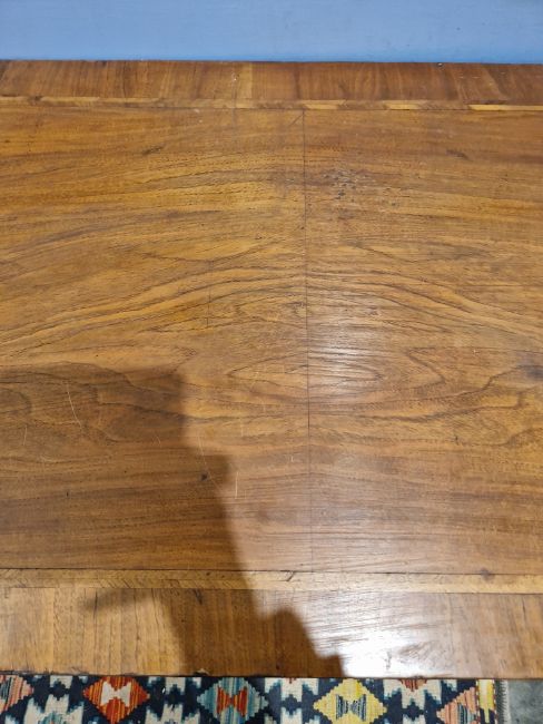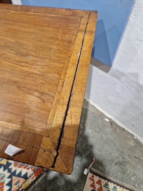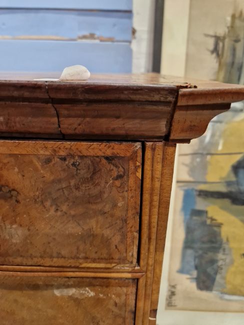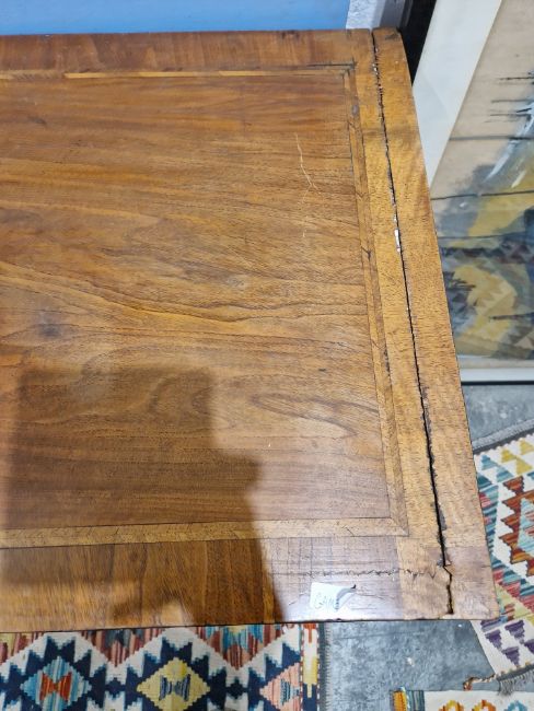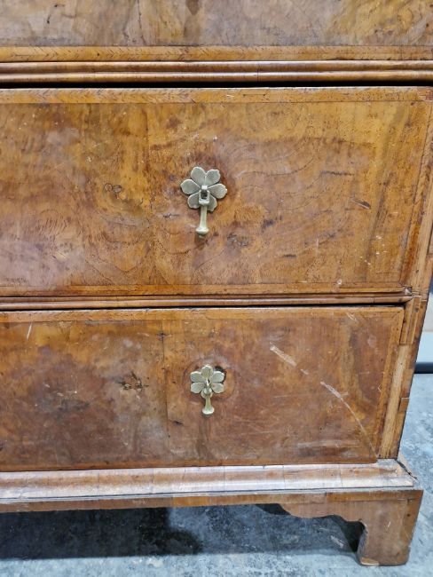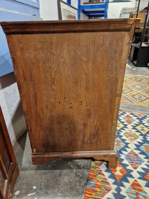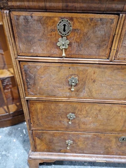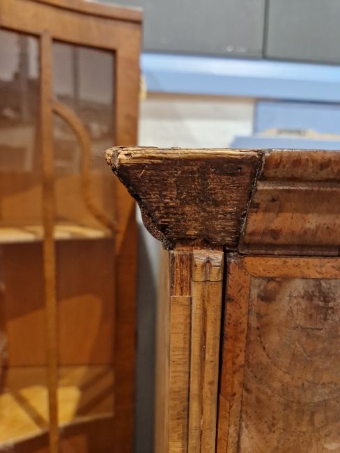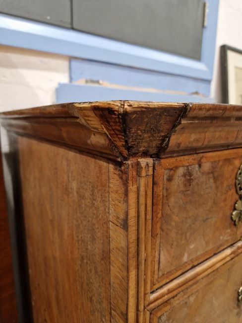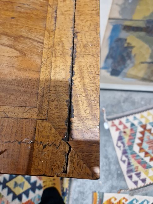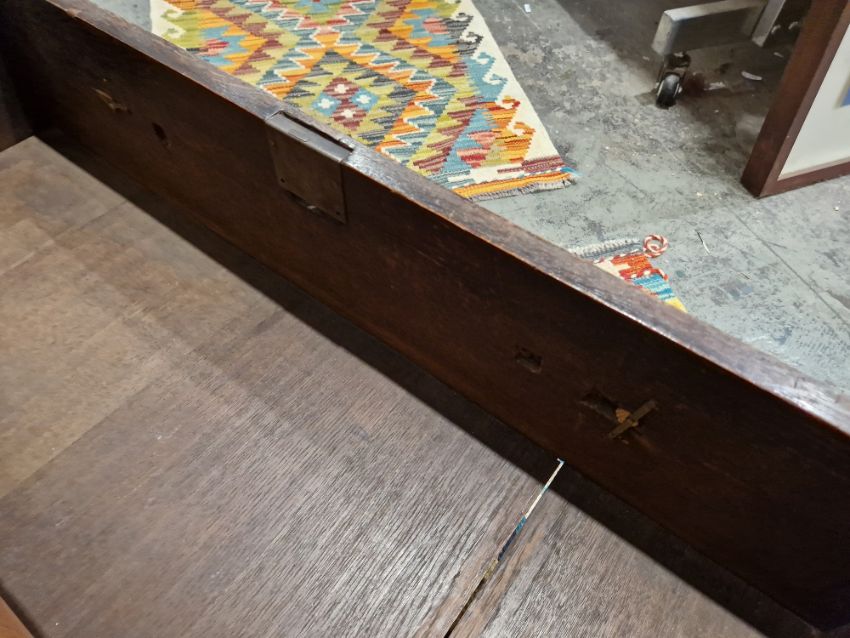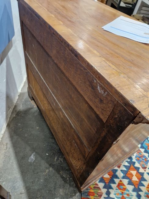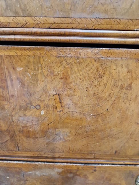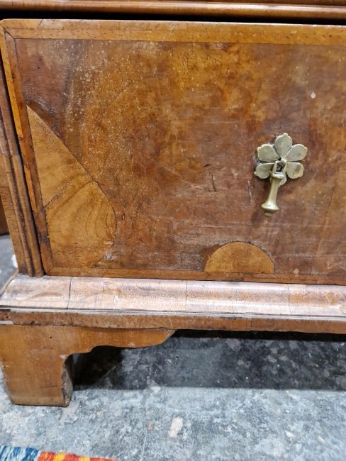 Surface scratches, scuffs and knocks. Fading/discolouration and stains. Numerous losses and repairs to veneer. Back left leg missing. Handles and locks not original, splits to top, top moulding on right side is coming away. Some has scratched their name into the right side. General wear and tear.