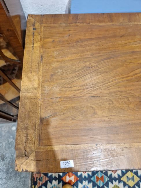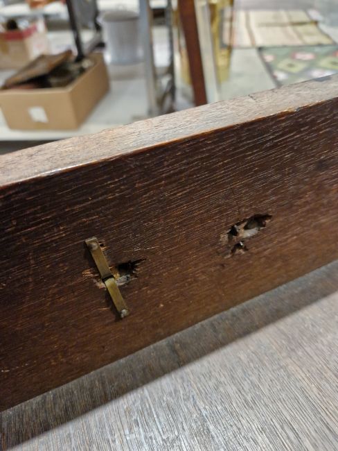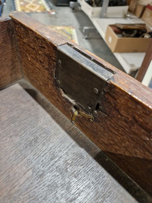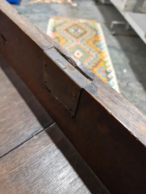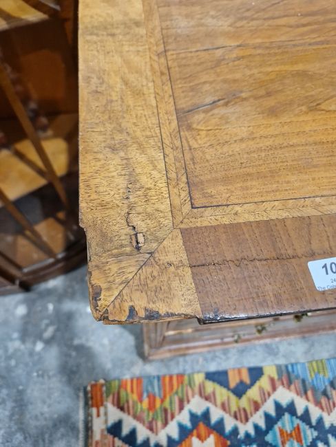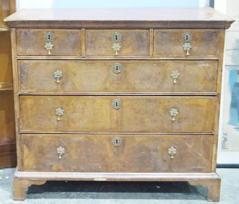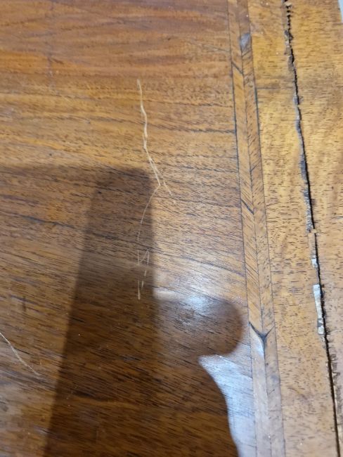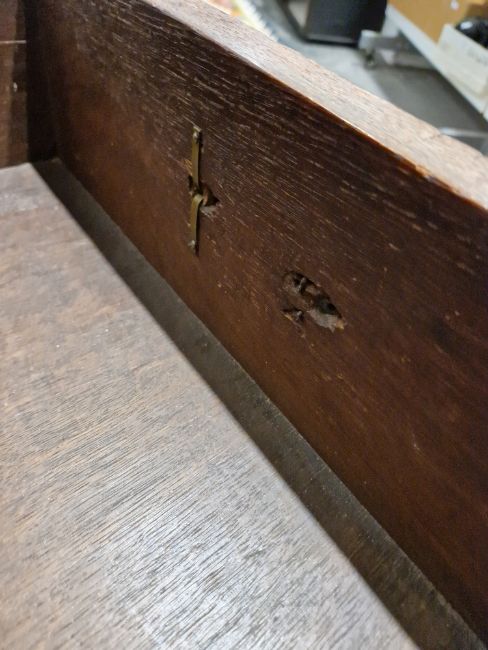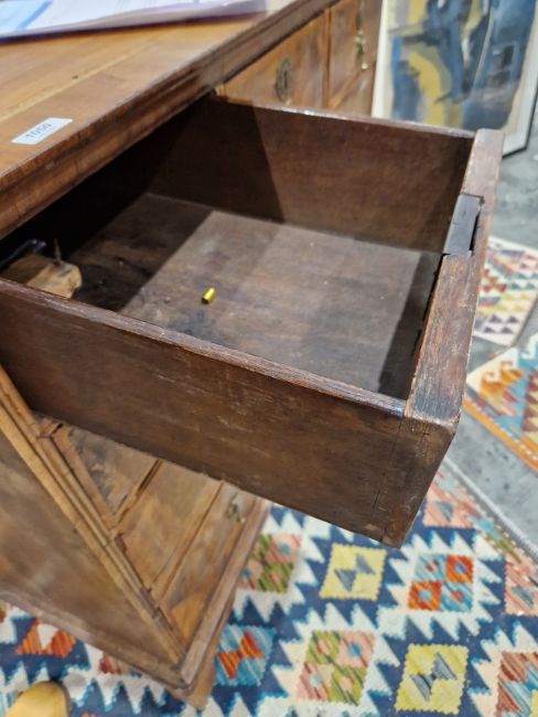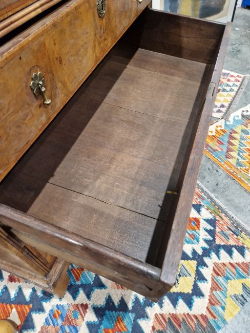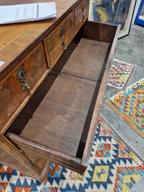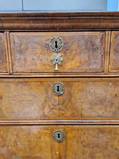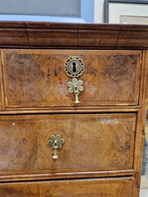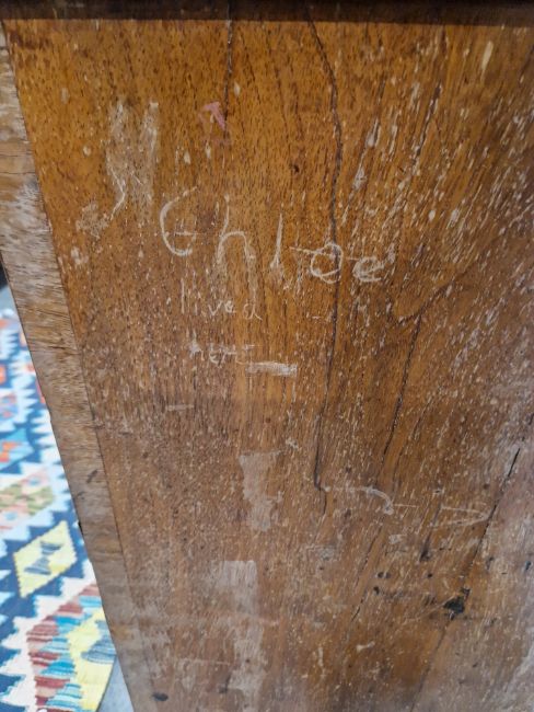 Surface scratches, scuffs and knocks. Fading/discolouration and stains. Numerous losses and repairs to veneer. Back left leg missing. Handles and locks not original, splits to top, top moulding on right side is coming away. Some has scratched their name into the right side. General wear and tear.