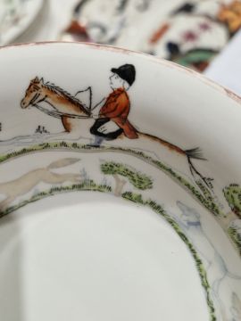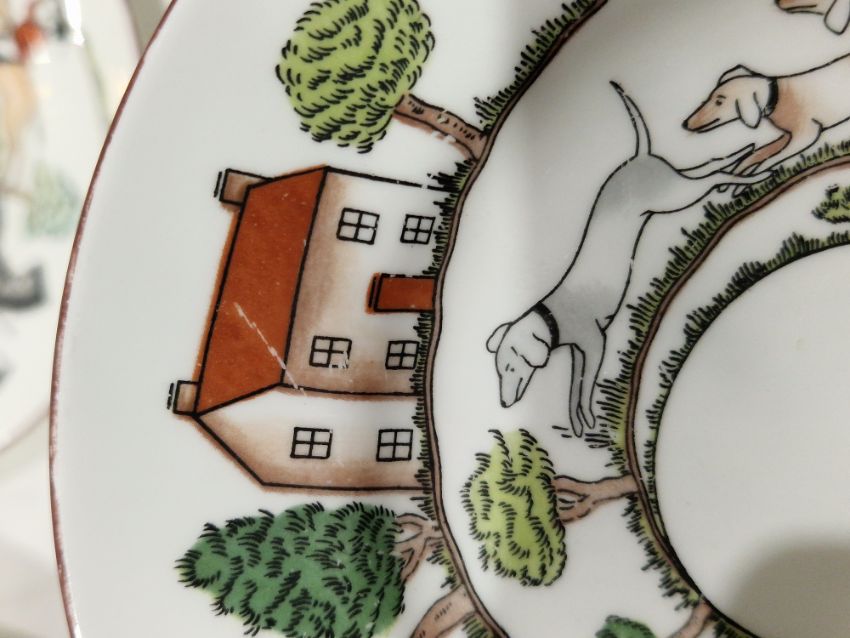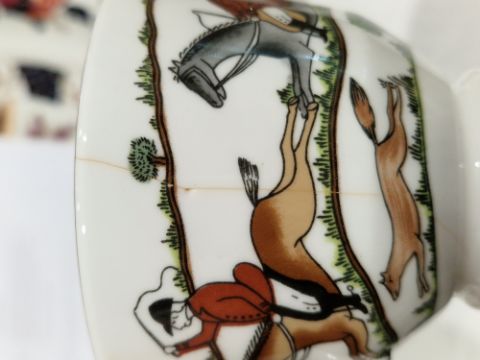 Light surface scratches, wear to decoration on some, 3 cups with cracks, signs of use to all. general wear and tear.