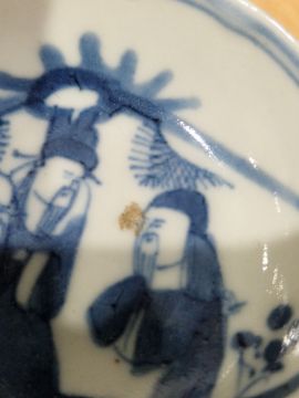 Chinese porcelain blue and white baluster-shaped snuff bottle with jade-coloured stopper and a small saucer, Qing Dynasty, each painted with figures in landscape, bottle 7cm high (chipping to foot rim of saucer) and three miniature blue and white dishes painted with fish within silvered frame (3)  Condition Report Bowl with light surface marks, accretions, imperfections in glaze. Tiny chip to rim, chips to base.Snuff bottle with light surface marks, accretions, imperfections in glaze. small hairline crack to neck/rim. unable to state condition of dishes as they are framed. There is a firing crack to one. All items with general wear and tear.