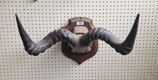 Pair of spirally ribbed antelope horns on shield-shaped oak wall mounts, 40.5cm wide