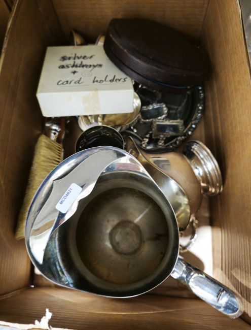 Cased set of four Edwardian footed salts with glass liners and four spoons, a white metal baluster water jug on four ball feet, a Georgian-style sauce boat on three shell cast feet, assorted sugar casters, shakers, an Art Nouveau white metal-mounted clothes brush, assorted wine bottle labels, a set of miniature white metal goblets cast with fruiting vine and other items