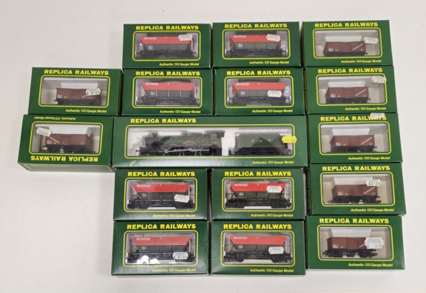 Replica railways 00 gauge boxed locomotive no.11151 Modified Hall GWR 6976 'Graythwaite Hall' together with a large quantity of boxed Replica Railways goods wagons to include 8 X no.14102 4GT GLW Hopper HEA and 7 X no.13402 16-ton steel mineral wagon, brown (16)