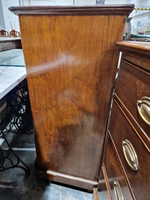 Surface scratches, scuffs and knocks. Fading/discolouration in places. Split to top. Loss to the moulding bottom left. Handles and locks look replaced. General wear and tear.