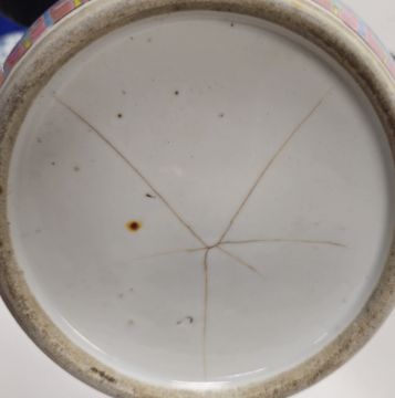 Chinese porcelain famille rose two-handled jardiniere, 19th century, painted with chrysanthemum and other flowers on a turquoise green ground within pink lappet-shaped borders, 19.5cm wide and a Chinese porcelain blue and white baluster vase converted to a lamp, four-character Kangxi mark in blue to base, late 19th/early 20th century, decorated with dragons and flaming pearls on a cloud and scroll-pattern ground, 26cm high (2) Condition Report The vase has been fitted to the neck with a light fitting which is still in place, although it has not been drilled through the base, it is in good order but has been filled with sand to weigh it down (please be aware when turning upside down!). The jardiniere has a hairline crack running from rim to body and then a spreading stained starcrack across base.